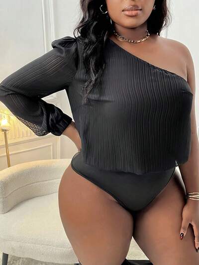 Plus Size Women's Elegant See-Through Asymmetrical Shoulder Long Sleeve Bodysuit