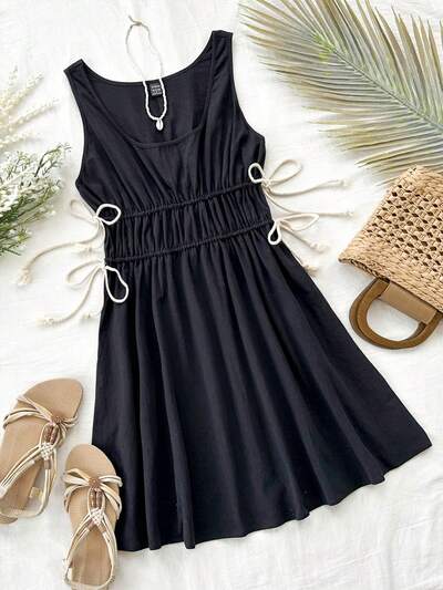 Women's Black Waist Drawstring Ruched A-Line Mini Dress With Adjustable Straps, Perfect For Vacation And Casual Wear
