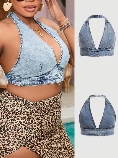 Plus Size Sexy Denim Top With Heart-Shaped Buckle, Halter Neck And Backless Design, Blue-30%