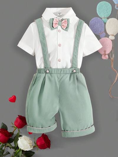 Young Boy's Elegant Colorblock Polo Shirt, Shorts, Bow Tie Gentleman Suit Set