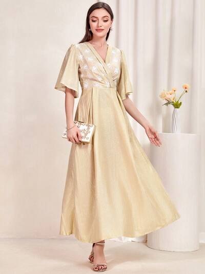 Floral Embroidery Butterfly Sleeve A-Line Dress Long Evening Dresses