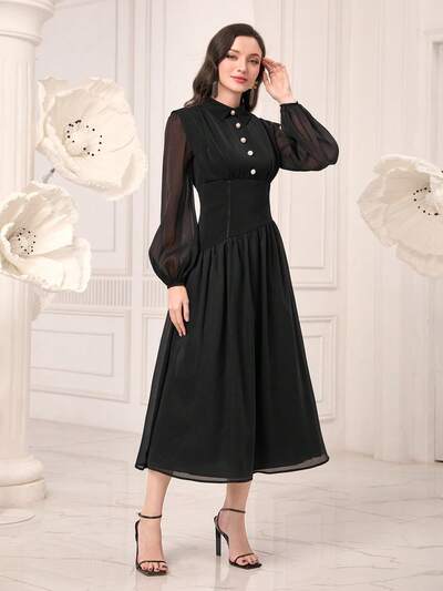 Lantern Sleeve Button Front Mesh Overlay Dress-60%