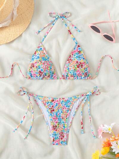 Summer Women Floral Print Halter Neck Bikini Set With Triangle Bralette And Tie-Side Bottom For Vacation-33%