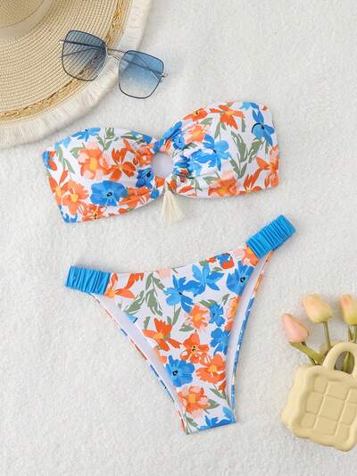 Women's Floral Printed Twist Front Bikini Set For Vacations, Random Print Summer