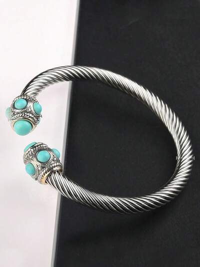 European & American Style Stainless Steel Cable Wire Bangle with Natural Stone Twist Detail, Adjustable Cuff Titanium Steel Bracelet