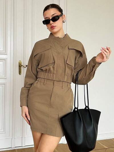 Drawstring Front Lantern Sleeve Cropped Top And Skirt Set-26%
