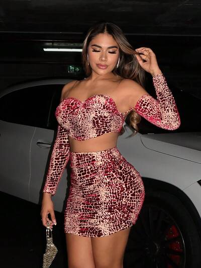 Sexy And Elegant Women'S Red Leopard Print Khaki Mesh Bottom Knitted High-Elastic Strapless Long-Sleeved Top And Tight High-Waisted Mini Skirt Set-26%