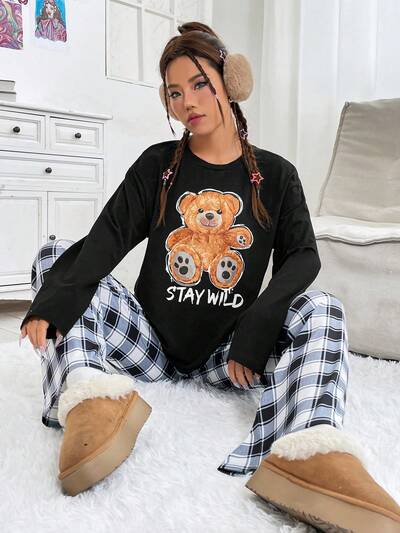 Women's Cartoon Bear & Letter Printed Top And Plaid Pants Set