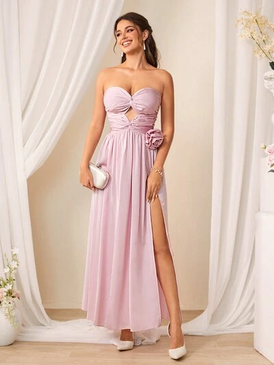 Solid Color Twisted Knot & Hollow Out & 3d Flower Decor High Split Strapless Bridesmaid Dress