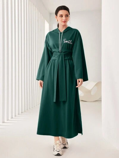 Letter Graphic Drop Shoulder Belted Hooded Dress-65%