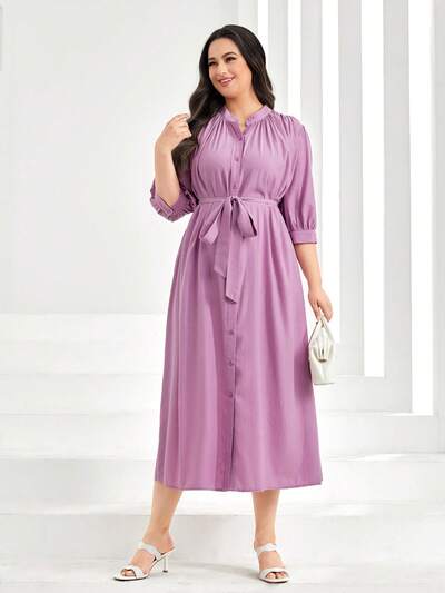 Plus Contrast Piping Button Front Shirt Dress Without Belt-65%