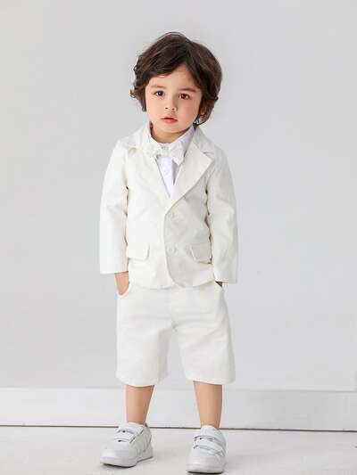 2pcs Young Boys Gentleman Suit Set - White Long Sleeve Blazer Jacket And Shorts, Fashionable And Stylish For Birthday Party, Formal Event, Wedding