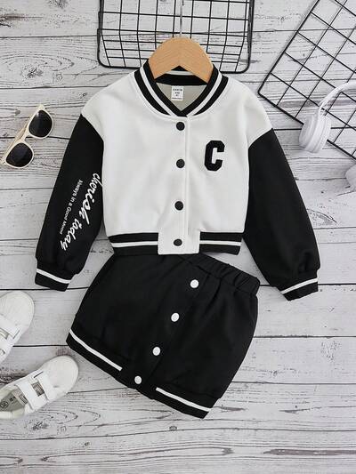 Little Girls' Letter Printed Contrast Color Baseball Collar Jacket And Skirt Set-60%