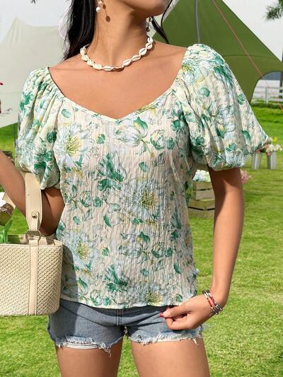 Women's Floral Print Short Puffed Sleeve Blouse-45%