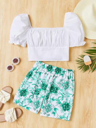 Teen Girl Casual 2pcs/Set Bubble Sleeve Shirt & Floral Print Shorts-60%