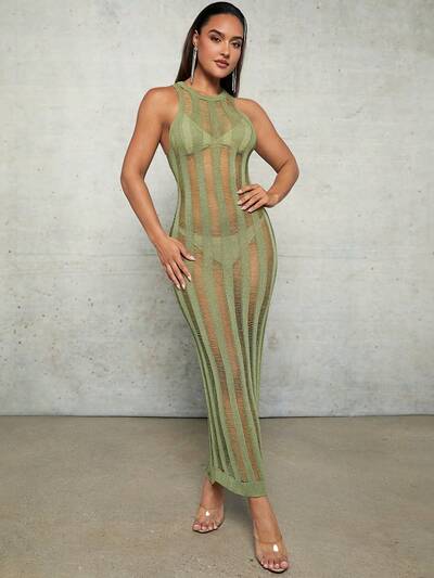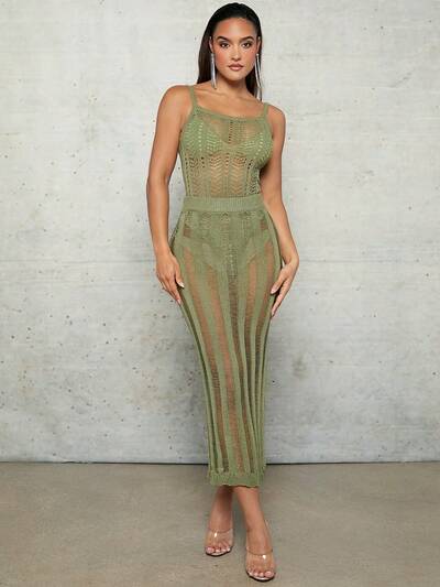 Cover Ups Green Crocheted Spring And Summer Holiday Clothes Hollow See-Through Vest Slit Mid-Length Women's Dress-32%