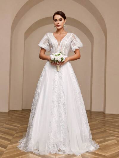 Elegantes, Perlenverziertes, Plissiertes Mesh-brautkleid Mit Laternenhülle Und Dramatischem Zug-60%