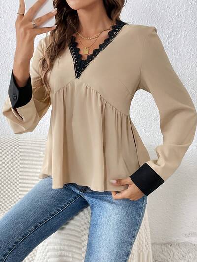 Bluse mit Kontrast Spitzen, Rüschenbesatz,-42%