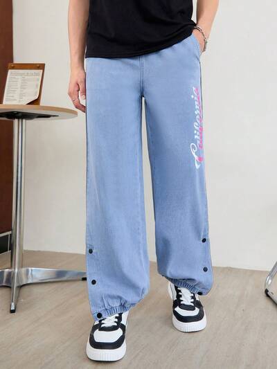 Teenager Jungen blaue modische Lässig Straße Sport Mix erfrischende Farbe Buchstaben Muster und Seitenknopf offenes Design elastischer Bund lang bequemer Dicke mäßig Baggy Denim für Urlaub und tägliches Tragen Sommerkleidung für die Schule