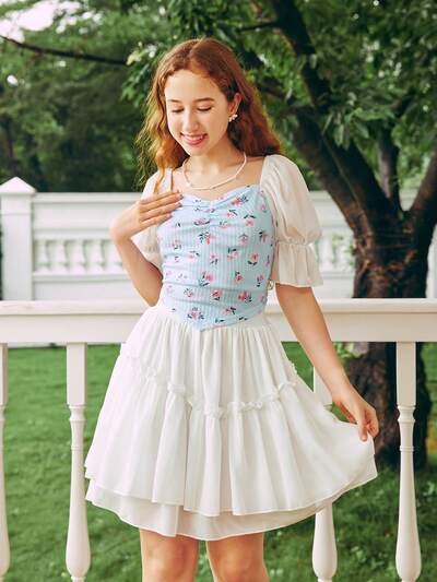 Sommerliches elegantes Kleid für Tweens (Mädchen im Vor-Teenageralter) mit Blumen Muster und kontrastierendem Mesh-Material