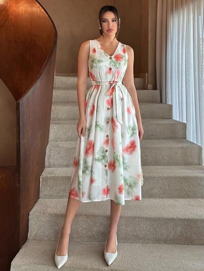 Frauen Urlaubsstil Krawattengefärbt Ärmelloses Einteiler Kleid Mit Einzelknopfverschluss-60%