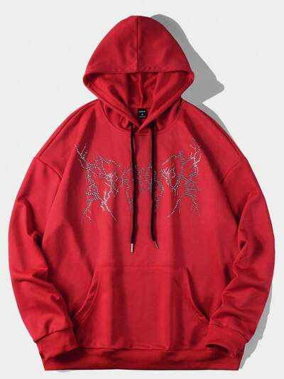 Sweat À Capuche Pour Homme À Coupe Ample Avec Garniture En Strass,poche Kangourou Et Cordon De Serrage-60%
