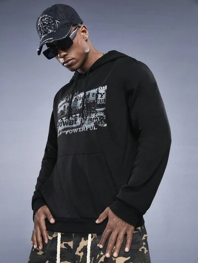 Sweat À Capuche Ample Pour Homme Avec Slogan Graphique, Poche Kangourou Et Cordon De Serrage-60%