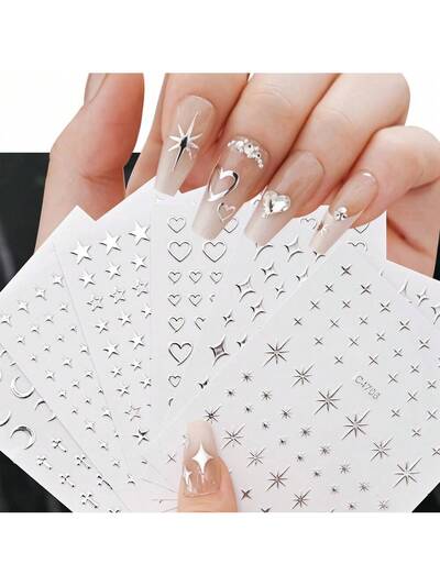 6 pièces Autocollants d'ongles métalliques argentés Y2K 3D Étoile Nail Art Autocollants Décalcomanies Autocollants d'art pour ongles métalliques Chaîne métallique Cœur Serrure Collier Ailes d'ange Décalcomanies pour ongles Autocollants de décoration d'ongles DIY Fournitures pour ongles