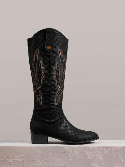 Bottes de mode pointues à talons hauts pour femmes, avec détail de broderie et hauteur jusqu'au genou, bottes cowboy pour femmes-14%