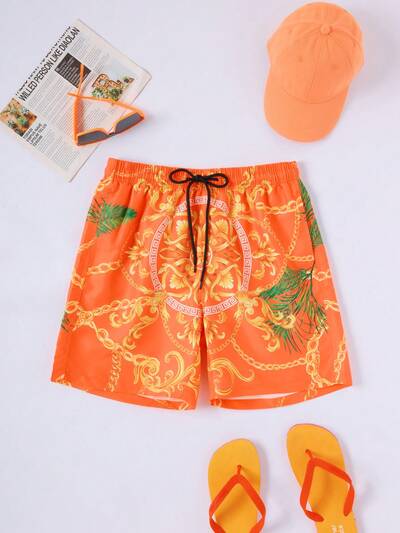 Short da mare uomo a stampa di piante tropicali con coulisse in vita e decorazione a catena, vestibilità ampia