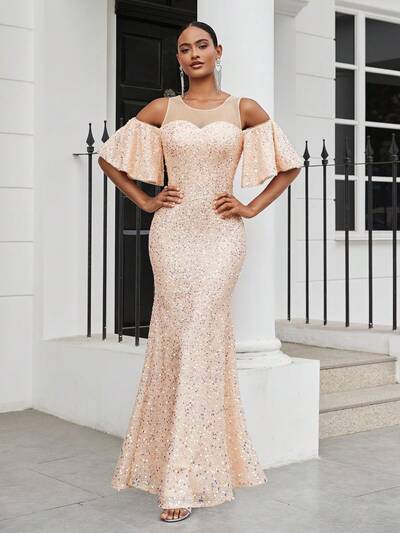 Abito da sera in contrasto meraviglioso ed elegante per le donne con spalle scoperte, mermaid con design a vita alta con pailettes e maglia , perfetto per promozioni, feste di laurea e appuntamenti-60%