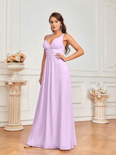 Elegante abito svolazzante con spalline in tonalità rosa, orchidea, viola chiaro, con scollo a V, corpino arricciato e cinghie incrociate sul retro. Adatto per la stagione dei matrimoni, i festival musicali, il giorno della festa della mamma, la stagione delle lauree, come abito da damigella d'onore.-60%