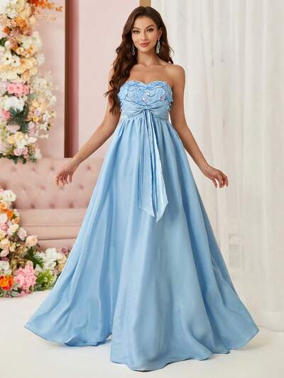 Vestito Da Sera Da Donna Con Fiocco Sul Fronte In Raso Lustrino Pesante, Con Ricami Floreali 3d E Superficie Brillante-60%