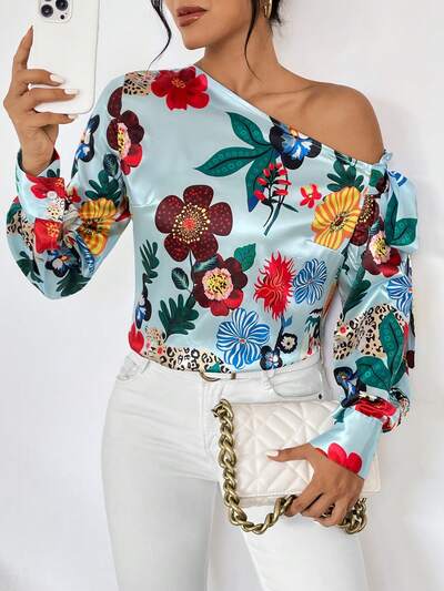 Camicetta con stampa floreale scollatura asimmetrica nodo laterale-65%