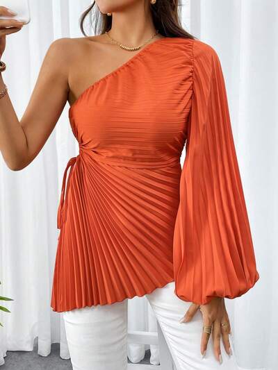 女性用シンプルでエレガントなソリッドカラーのワンショルダーブラウス、ホローワイスト、非対称な裾、プリーツデザイン、夏と春に最適-32%