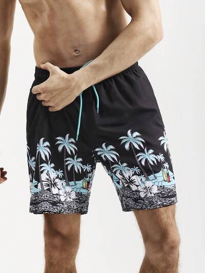 남성 야자수 프린트 신축성 허리 밴드 와이드 레그 바캉스용 비치 반바지 (랜덤 컷 프린트)-65%