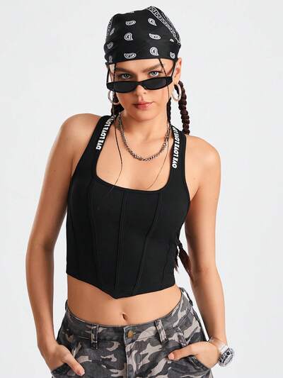 여성용 여름 비대칭 헴 레터 그래픽 크롭 스포츠 탱크 탑-68%