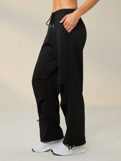 솔리드 컬러 하이웨이스트 헐로우 아웃 드로우스트링 스포츠 팬츠-60%
