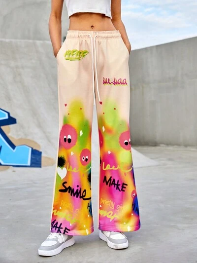 카툰 패턴 스포츠 바지 벨 바텀 레이브 팬츠/바지 Y2K 플레어 팬츠 여성 플레어 스웨트 그래픽 팬츠-60%