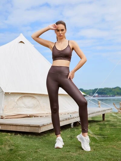 사이드 스트라이프 스포츠 타이츠 하이 스트레치 복부 제어 운동 레깅스 요가 여성 바지코팅 된 가죽 효과 'shine On Me' V넥 액티브 탑 경량 보조