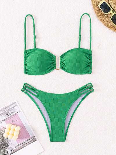 여성 체크무늬 텍스처 투피스 비키니 세트 여름용 비치웨어-32%