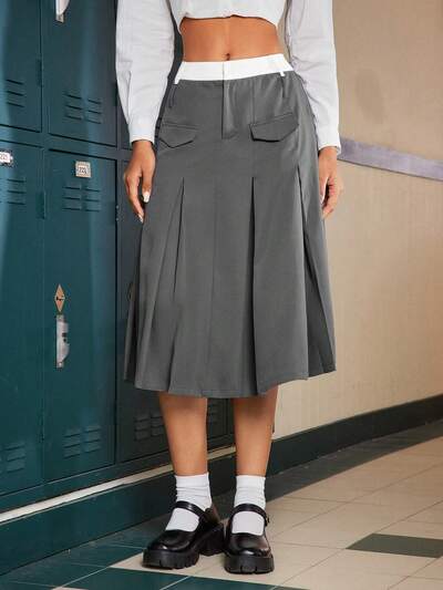 여성용 컬러 블록 하이웨이스트 플리츠 스커트-60%