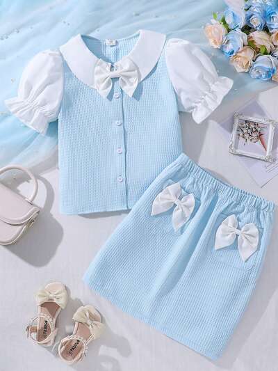티인 소녀들의 피터팬 칼라 버튼 업 탑, 보우와 스커트 세트-45%