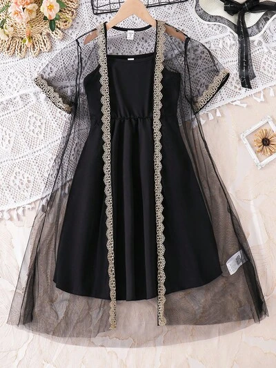 2개/세트 중학생용 우아한 메쉬 재킷과 캐미 드레스-46%