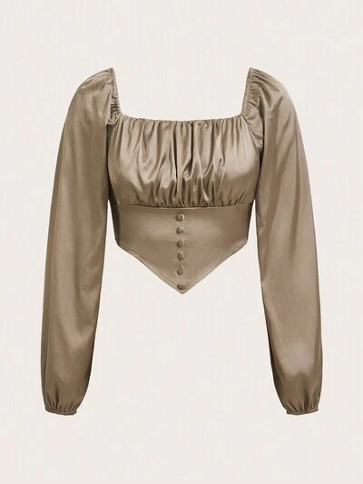 Solid Button Front Shirt Without Belt,Ruffle Long Sleeve Top-65%