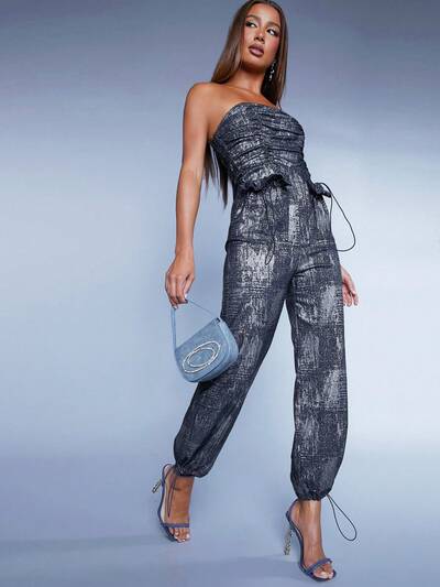 Print Drawstring Ruched Tube Jumpsuit-65%