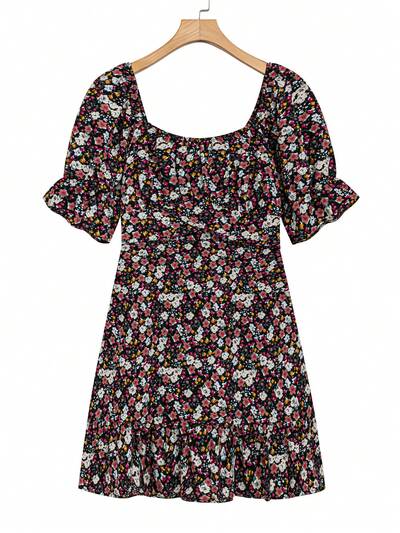 Plus Size Floral Print Pleated Batwing Sleeve Split Dress For Summer