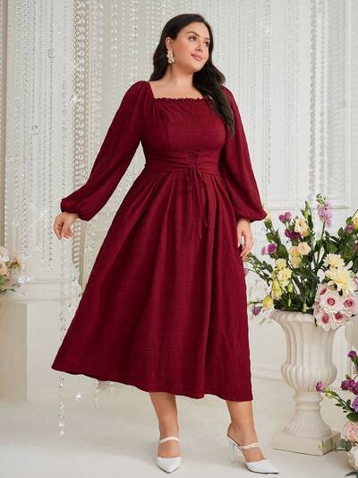 Burgundy Red Plus Size Solid Color Square Neck Lantern Sleeve Dress Long Evening Dresses