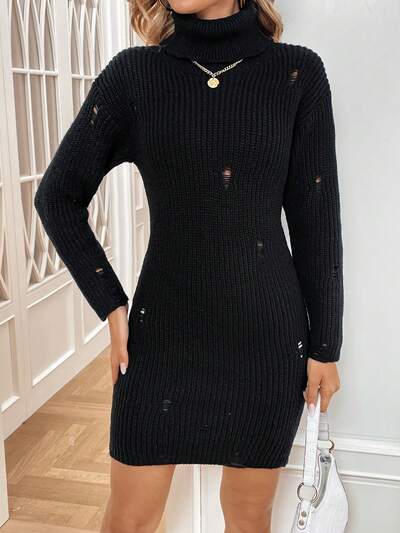 Turtleneck Ripped Drop Shoulder Sweater Dress Fall Cloth For Women-60%