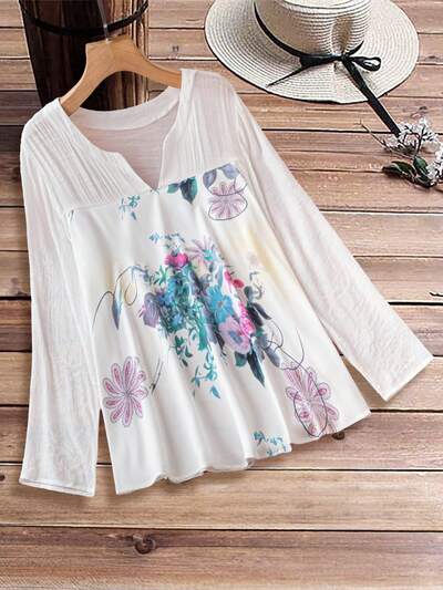 Plus Size Women's Floral Print Notched V-Neck Long Sleeve Shirt-30%